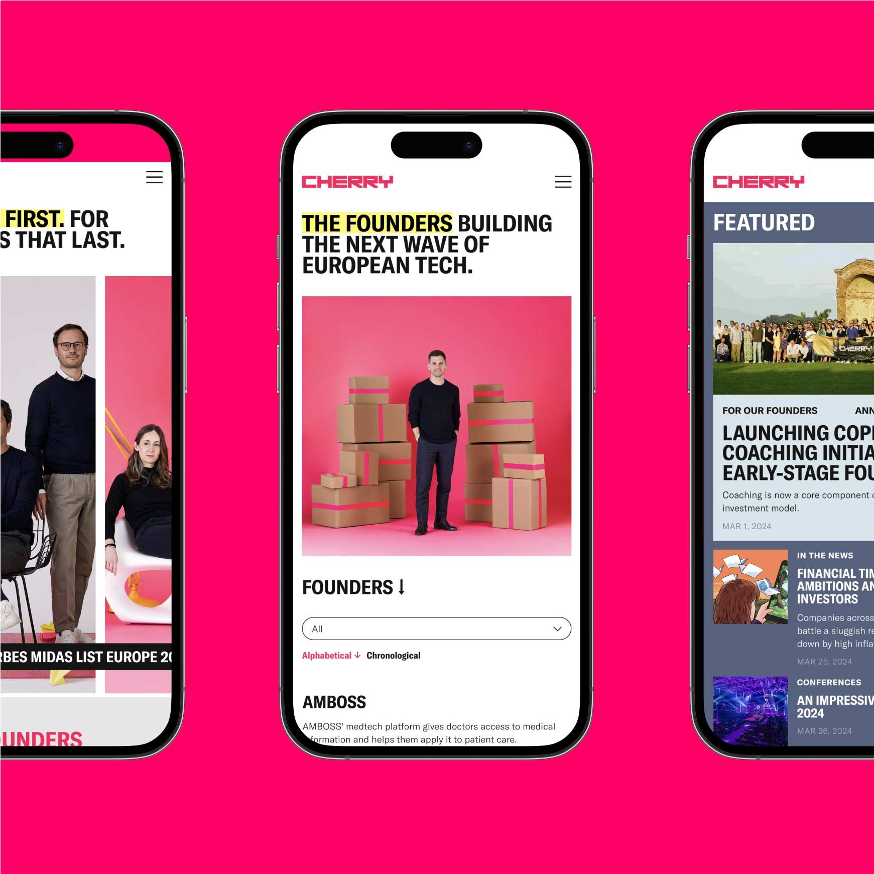 The original logo serves its purpose with grace and is very dear to the Cherry team. So we didn't fix what isn't broken – instead, we gave the logo a slight glow-up, as well as designed a horizontal version to allow more versatile usage. We also kept the iconic Cherry pink at the core of the visual identity but used it more judiciously: to put the spotlight on founders. Using clear white and black as primary colors communicates establishment and gives pink more of a centerpiece role – alongside its sidekick highlighter, bright yellow. Paired with bold typography and strong contrasts, Cherry definitely makes a shiny, show-stop-confident impression.